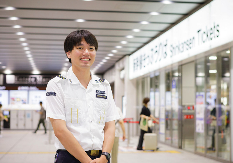現在の職場は、東京方面から関西へのアクセスの拠点とも言えるJR新大阪駅です。関西最大級のターミナルで、お客様がスムーズに目的地に到着できるよう、改札口でのご案内・接客や切符売り場の業務を担当しています。旅行・移動中のお困りごとへのスムーズな対応や、急いでいるお客様に効率よく切符を販売できるように日々工夫を重ねていますが、そんな中、高齢のお客様の旅行ルートを一緒に考えて、後日お礼状をいただいたことがありました。「あの時、駅員さんによくしてもらったから」と同僚に託してくださった手紙が私の手元に巡ってきた時のなんともいえない嬉しい気持ちは忘れられませんね。前勤務地の静岡運輸区では、在来線の車掌業務も経験しました。もともと自分が旅行好きということもあり、多くの方の旅や移動の役に立てることはこの上ない喜びです。