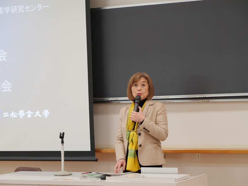 はじめに本学陽明学研究センター長の牧角悦子文学部教授から開会挨拶および当特別後援会の開催趣旨説明後、本学で定例開催中の「三島中洲研究会」と「山田方谷研究会」に関する発足経緯やその目的について説明が行われました。