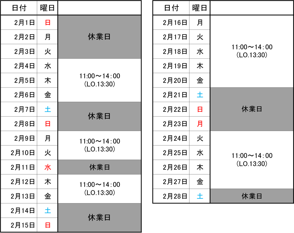 2026年2月の営業予定