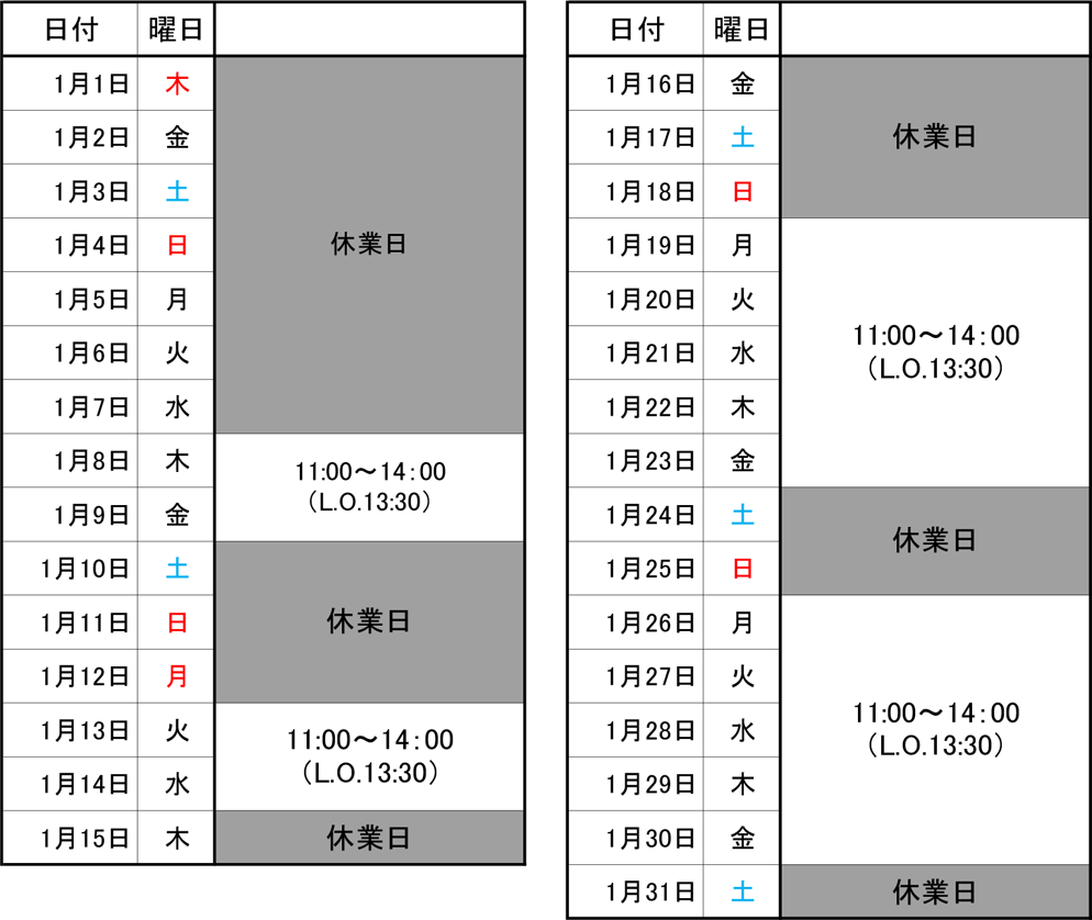 二松学舎大学13階展望レストラン “Café sora” 1月の営業予定について