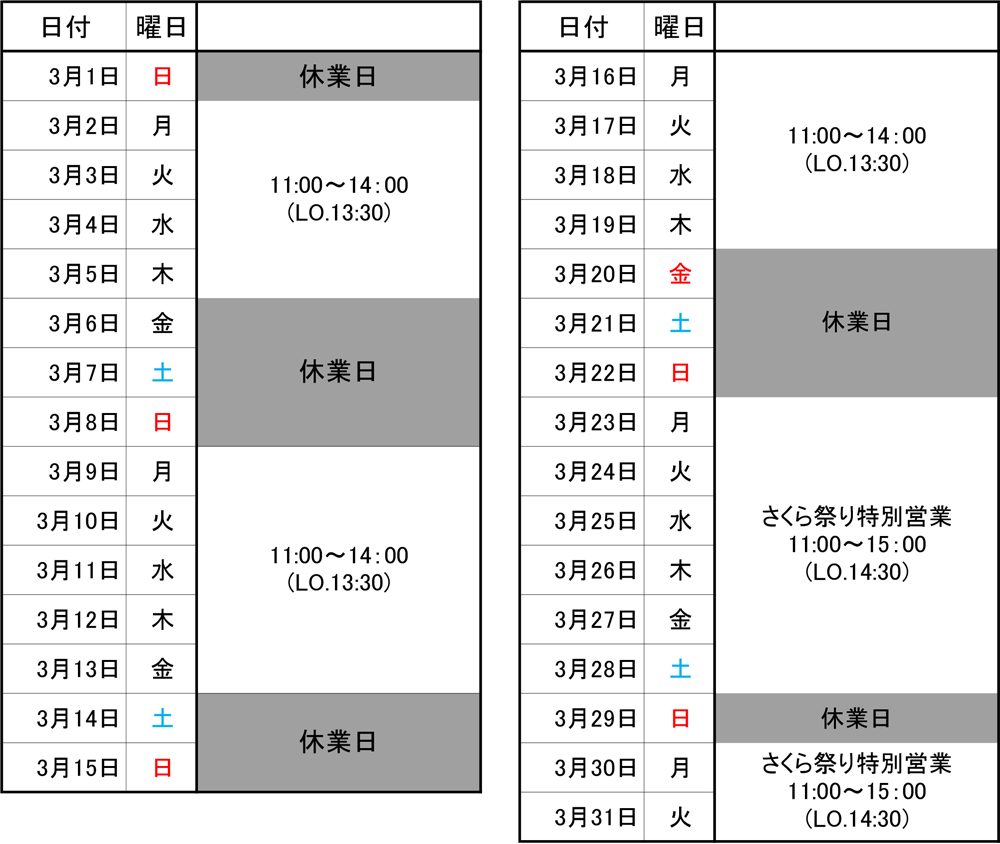 2026年3月の営業予定