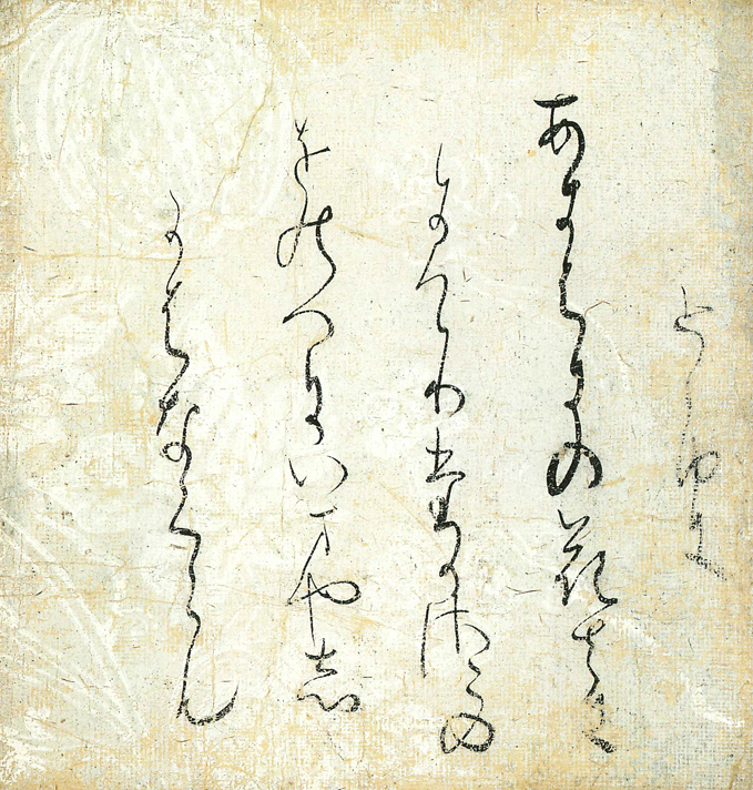 また、図3の「寸松庵色紙すんしょうあんしきし」も平安時代の書で、古今和歌集に収録されている藤原敏行の和歌を書いています。行頭の高低により視線が自然に流れるように設計されていますね。仮名の書の世界は、この時代に「空間という美の領域」も獲得しています。