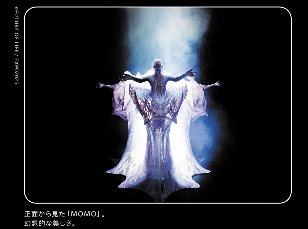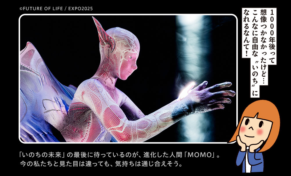 さて、階段を降りて1階に戻ると出会うのが、進化した人間「MOMO」。ゾーン3「1000年後のいのち“まほろば”」では、テクノロジーの進歩によって、肉体という制約から解放され、自由に姿を選べるようになった人間が表現されています。光やスモーク、香り、音楽などの演出にあわせ浮遊するMOMOは、神秘的で幻想的。別世界にいるような気持ちになりながらも、MOMOと目が合った瞬間に感じたのは、確かに「いのち」でした。