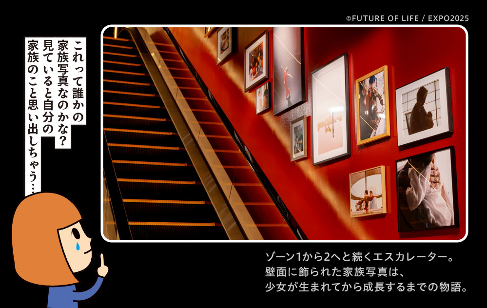 奥へ進むと、2階に上るエスカレーター。赤い壁面には幸せそうな家族写真が飾られています。入り口で配布されたイヤホンガイドからは、祖母と孫である少女の楽しげな音声が。ここから家族の物語が展開されるようです。