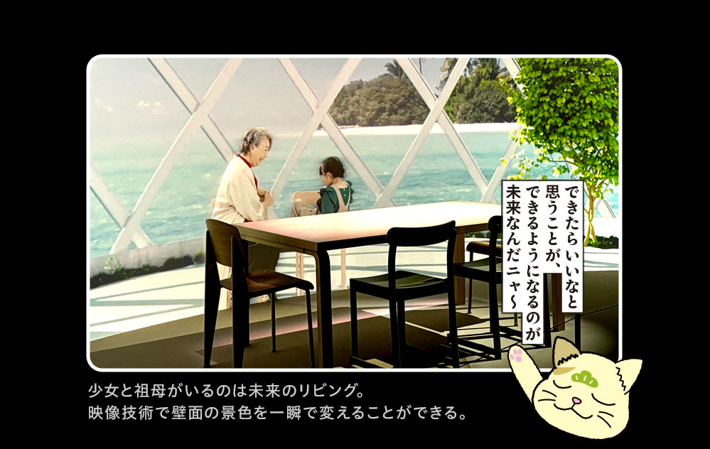 未来の電車が停まると、カラフルで不思議な形をしたロボット「ペトラ」が次の部屋へ案内してくれました。そこは未来のリビング。祖母が「今日はどんなお家がいい?」と尋ねると、少女は「海。すっごい近いところがいい!」と無邪気に答えます。すると壁が一気に変わって、砂浜をのぞむリゾートホテルのような景色に。テクノロジーの進化にワクワクしてきます。