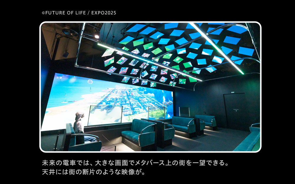 2階に着くと、きれいな植物に囲まれたベンチにアンドロイドが座り、前の壁には祖母と少女の映像が投影されています。二人の背中に誘われ、壁の扉が開いた先に進むと、次の部屋には電車を再現した空間が広がります。座席に座り、車窓に流れる未来の風景を楽しんでいると、突然、電車が大きなバブルに包まれて仮想空間に突入。アトラクションに乗っているような楽しさです。その後、トンネルに入った電車の薄暗い車内には、先ほどの祖母と少女の姿が。少女が「そこの席に座っている人いるでしょ、あの人アンドロイドだよ」と言うと、祖母は「全然わからなかった」。
