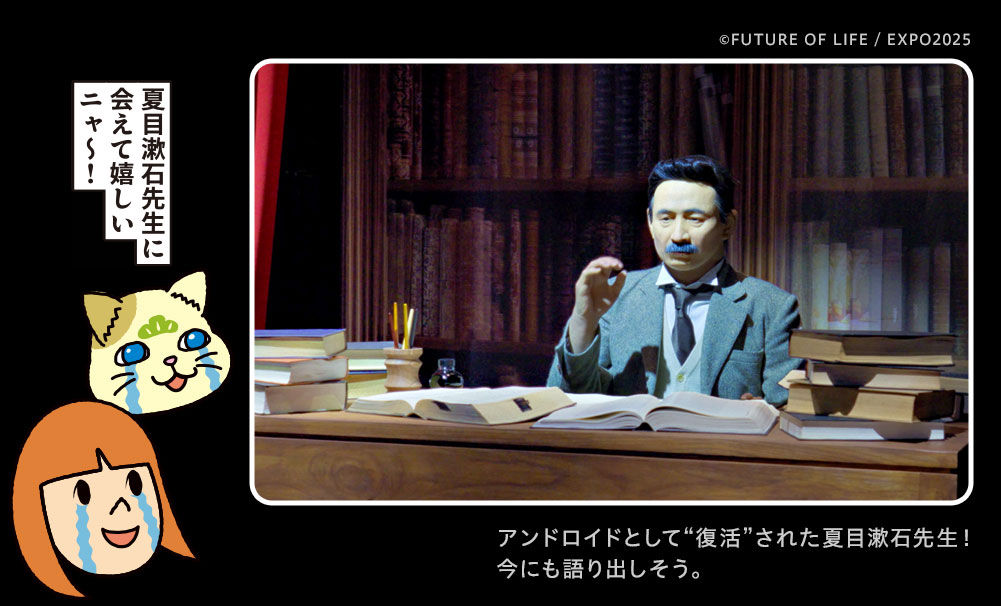 こんにちは! 本誌「學」編集長のエチゴヤです。現在開催中の大阪・関西万博では、ロボット研究の第一人者・石黒浩先生(大阪大学教授、ATR石黒浩特別研究所客員所長)がパビリオン「いのちの未来」をプロデュース。わたしたち二松学舎も「漱石アンドロイド」を出展するという形で、サプライヤーとして協賛しています。さっそく、ねこ松と一緒に会いに行ってきました!