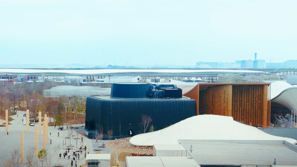 中央の黒い建物が、パビリオン「いのちの未来」。重厚なたたずまい。