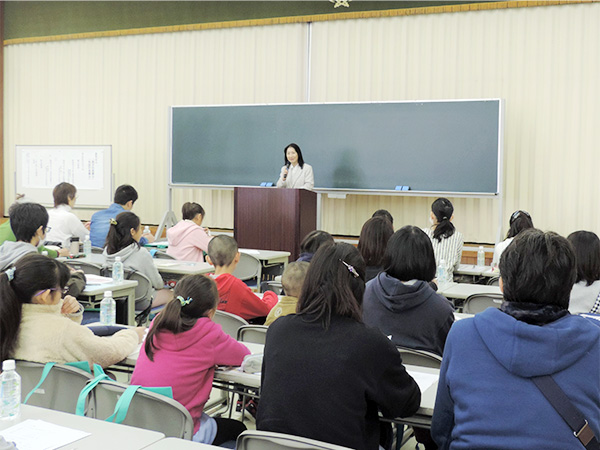 前半は、牧角悦子文学部長による「論語で学ぶ漢字の基礎力」と題し、漢字・文字の成り立ちや意味、学ぶことの意味などを丁寧に分かりやすく解説しました。