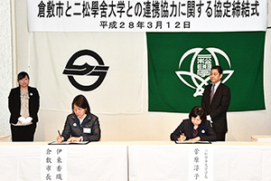 平成28年3月12日(土)、二松學舍大学と倉敷市とは、学芸・文化観光等の分野において、双方の資源を有効に活用した活動を推進し、地域社会の持続的な発展に寄与することを目的として、両者の間に連携協力に関する協定を締結しました。