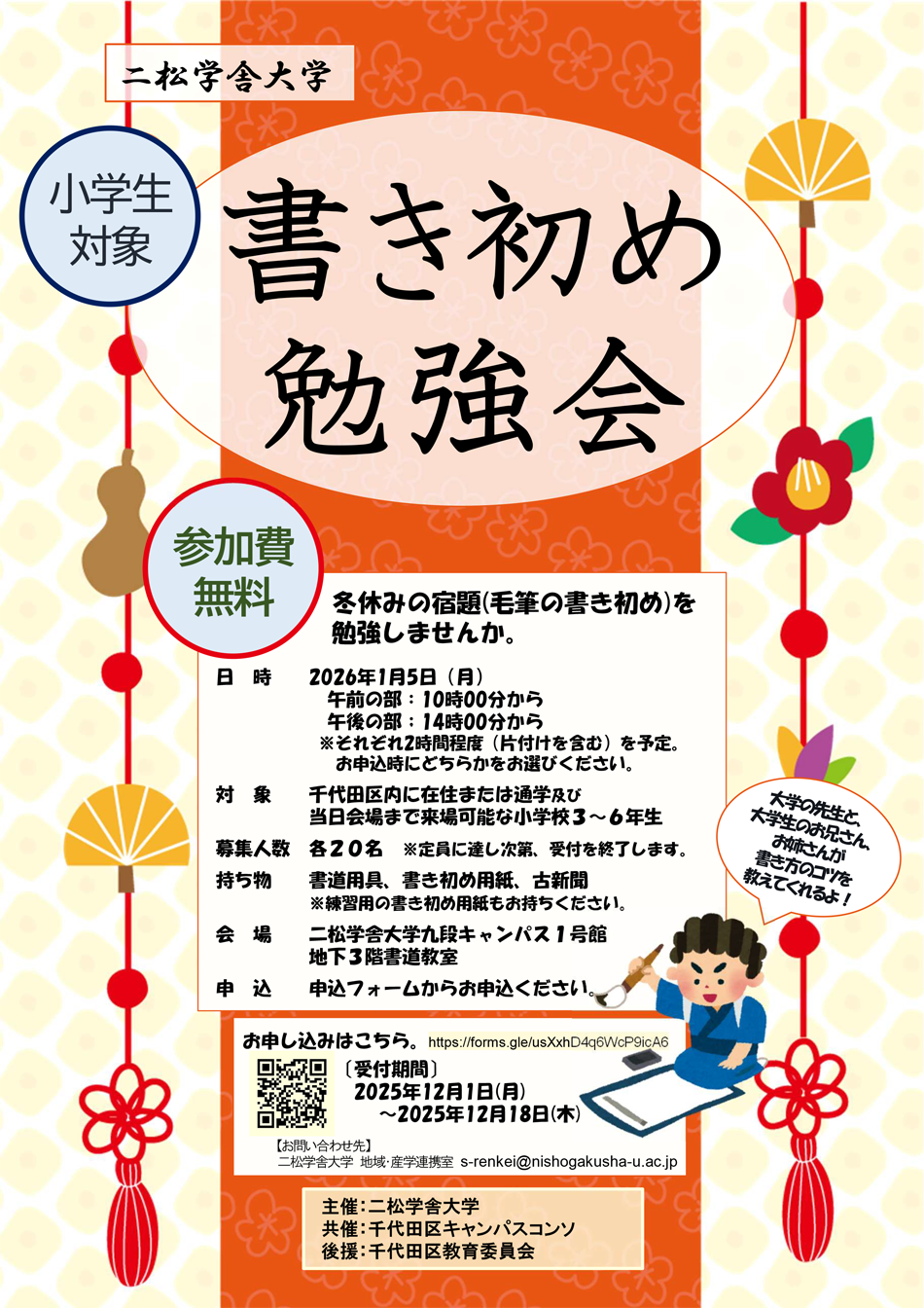 二松学舎大学では、千代田区キャンパスコンソと共催で、千代田区内に在住または通学する小学生を対象とする「書き初め勉強会」を開催します。