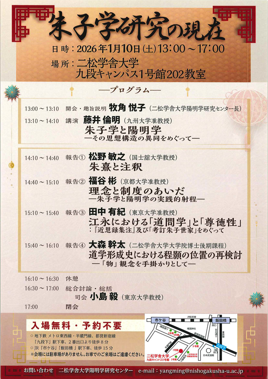 二松学舎大学 陽明学研究センター 公開シンポジウム 「朱子学研究の現在」開催のお知らせ 開催日時2026年1月10日(土) 13:00~17:00会 場二松学舎大学九段キャンパス1号館2階 202教室 ※ 入場無料・予約不要 チラシのダウンロード(PDF)